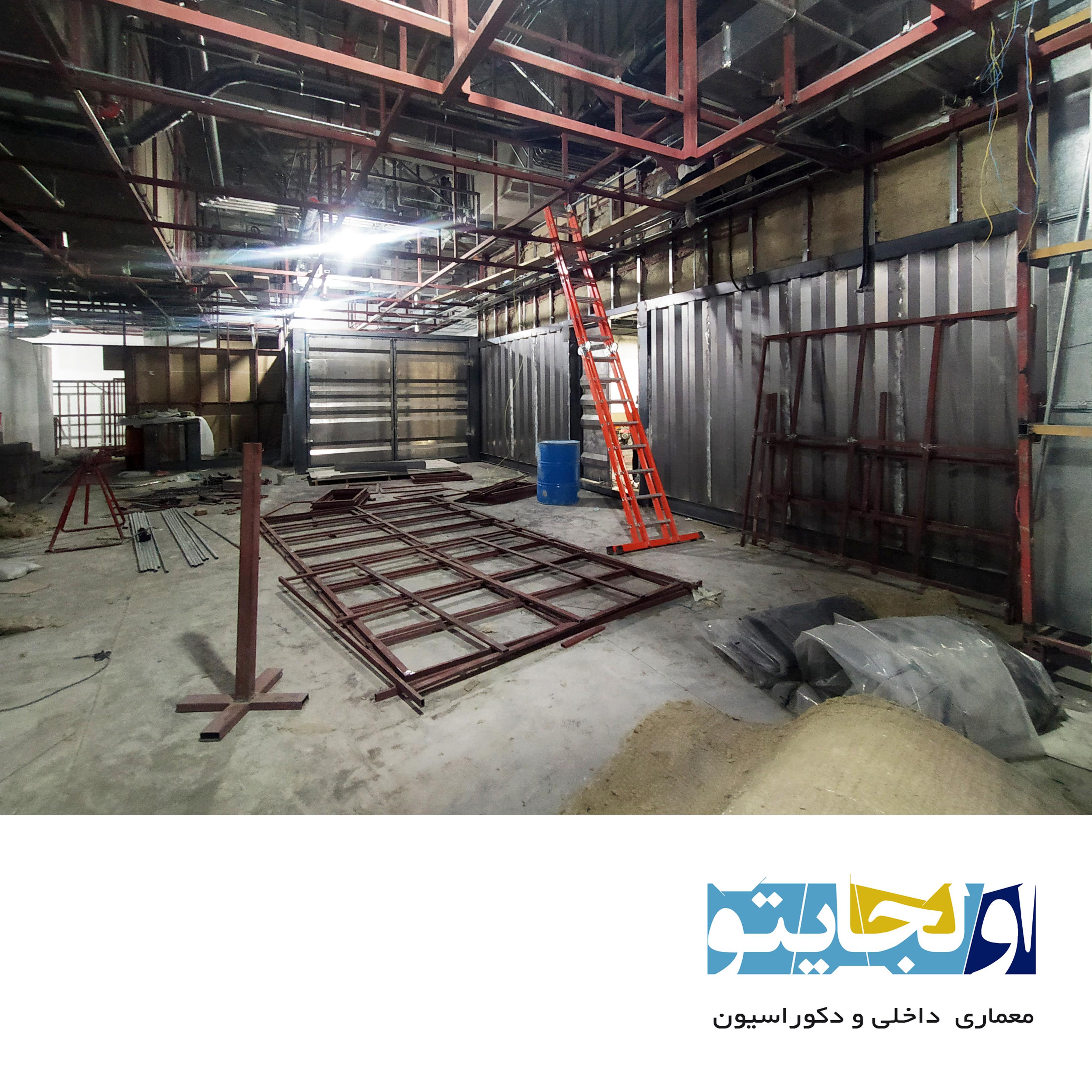 ساختار اصلی شامل دیوارهای کانتینری، دو واحد کافیشاپ فلزی و دربهای کانتینری تکلنگه و دولنگه با یراقآلات واقعی است.